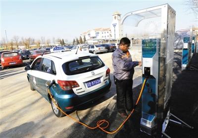 今年1月28日,在15號線順義俸伯地鐵站周邊的本市首個“P+R”充電場站,出租車司機給電動出租車充電。資料圖片