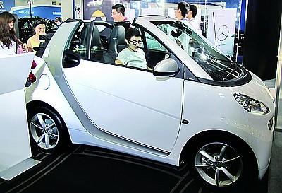 面對汽車二氧化碳排放量對人們的影響,眼下在國內,豐田、標致、大眾、雪佛蘭、雷諾、寶馬等知名品牌都紛紛推出了新款小型車,它們以其重量輕、引擎小、排放低的特點,受到消費者的青睞。圖為一新款低耗能汽車在展示中受到觀眾喜愛。