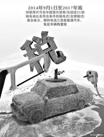 根據規定,今年9月1日至2017年底,對獲得許可在中國境內銷售(包括進口)的純電動以及符合條件的插電式(含增程式)混合動力、燃料電池三類新能源汽車,免徵車輛購置稅。