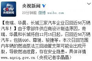 人民網北京11月18日電 據中央電視臺新聞中心官方微博消息,由于零部件供應商設計制造原因,奇瑞、華晨和長城將自12月15日起,召回近56萬輛汽車。包括QQ6、尊馳、駿捷等。本次召回范圍內車輛的燃油泵法蘭回油管支架可能會出現開裂,導致燃油泄露,存在安全隱患。