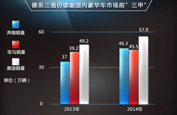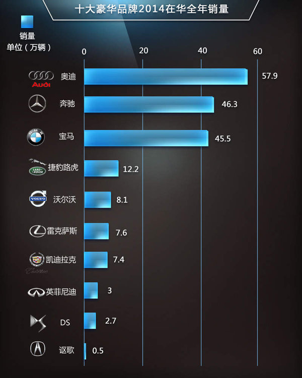 根據中國汽車工業協會最新的統計數據顯示,2014年,中國汽車銷量達到2349.19萬輛,同比增長和6.86%,再度問鼎全球第一大汽車銷售市場。而在這十大豪華品牌中,奧迪憑借自身品牌優勢取得57.9萬輛的銷量表現,領跑整個豪華車市場,佔整個中國車市2.5%的比例。