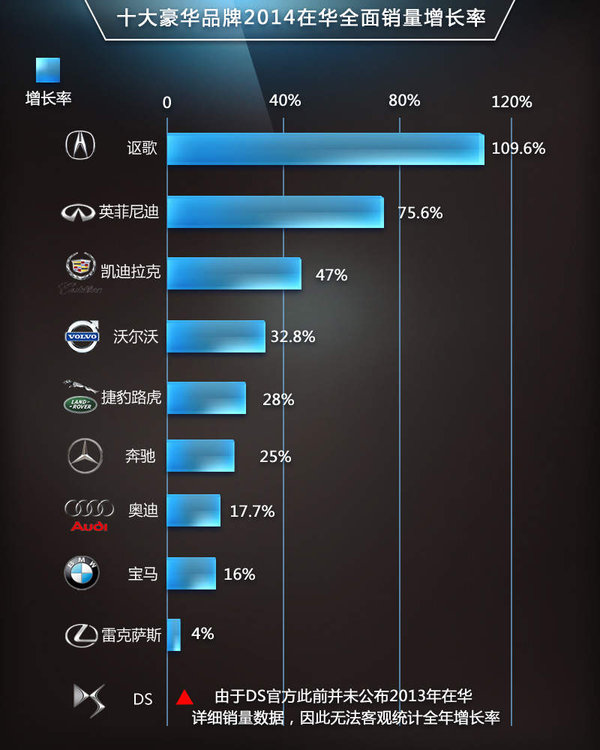 盡管謳歌2014年在華市場銷量數據並不搶眼,但對于自身而言可謂是一個較大突破,並以接近110%的增速居于增速榜第一位。不得不提的是,謳歌距離2016年國產的日期越來越近,這也將為謳歌品牌深耕中國市場提供動力。同為日係豪華品牌的英菲尼迪則以75.6%的增速位于第二,沃爾沃、捷豹路虎、奔馳增速相差並不大。