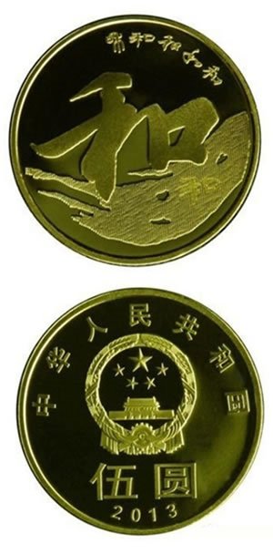 據了解,中國人民銀行“和”字行書普通紀念幣于9月23日開始發行。“和”字書法---行書普通紀念幣正面主景圖案為中華人民共和國國徽,內緣上方刊“中華人民共和國”國名、下方刊面額“伍圓”及年號“2013”;背面主景圖案為“和”字的行書書法,襯景圖案為書法的飛白,內緣右上方刊“和”字的五種書法體。