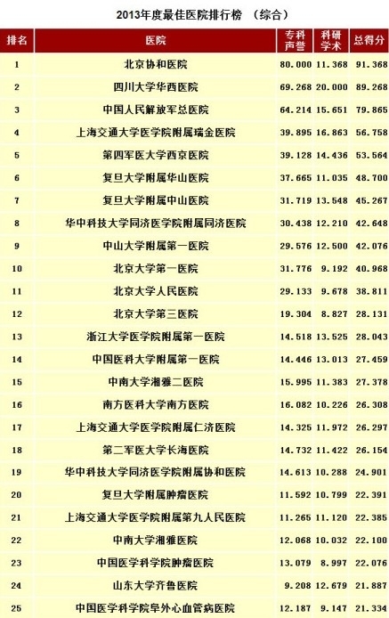 中新網上海11月1日電 (孫國根 陳靜)《2013年度中國最佳醫院綜合排行榜》、《2013年度中國最佳醫院專科匯總排行榜》和《2013年度中國醫院最佳專科聲譽排行榜》1日在上海“出爐”:北京協和醫院、四川大學華西醫院和中國人民解放軍總醫院名列中國最佳醫院(綜合、專科匯總)排行榜前三甲。民營醫院首度上榜。