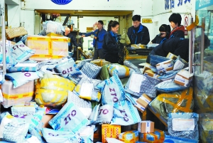 昨天是“雙11”,快遞公司變得異常忙碌。甘家口附近某快遞公司的收發件中轉站,寄送的快件堆積如山,工作人員忙著整理。 本報記者 和冠欣攝
