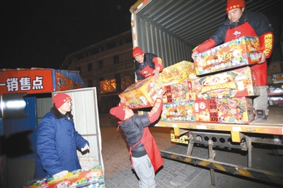 昨晚,海淀百旺家苑南門一花炮銷售點,工作人員將花炮卸下。春節煙花配送今日淩晨正式啟動。新京報記者 王貴彬 攝