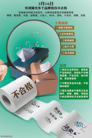 北京市消協此次從北京物美、沃爾瑪、宜家、錦繡大地等多方隨機購買了30種紙巾紙和35種衛生紙。經國家紙張質量監督檢驗中心測試,分別有14種紙巾紙、12種衛生紙不符合國家標準或標志不合格。所幸的是,所有測試的紙巾紙都不含熒光增白劑,未發現使用回收廢紙生產紙巾紙,但制造工藝水平不高。