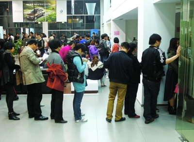 3月25日,杭州市政府召開新聞發布會宣布,從26日起對本市行政區域內小客車實行增量配額管理指標,增量指標須通過搖號或競價方式取得。當日各家4S店紛紛挑燈夜戰,把營業時間延長到晚上12點,現場人頭攢動。(C FP供圖)