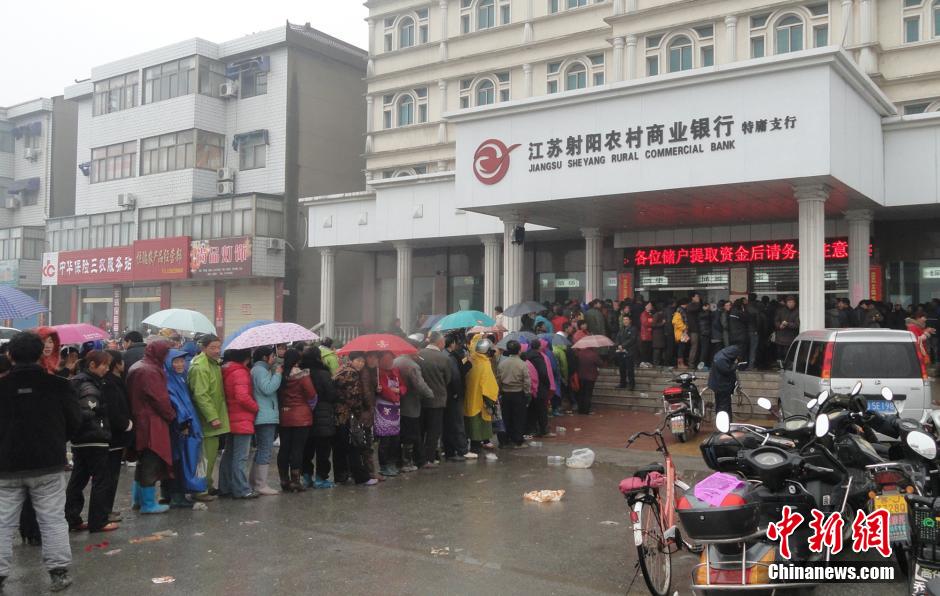 3月25日,民眾在江蘇射陽農村商業銀行特庸支行門口排隊兌付。從3月24日開始,江蘇射陽農村商業銀行慶豐分理處網點,遭遇近千群眾擠兌現金。據悉,這是由一則該行要“倒閉”的謠言引發的擠兌事件。隨著謠言的擴散,擠兌潮仍在持續,且擴至周邊鄉鎮。目前,該行啟動大批量現金供應,確保儲戶兌付到位。同時銀行和警方正在加大宣傳力度,請群眾不要相信謠言。中新社發 谷華 攝