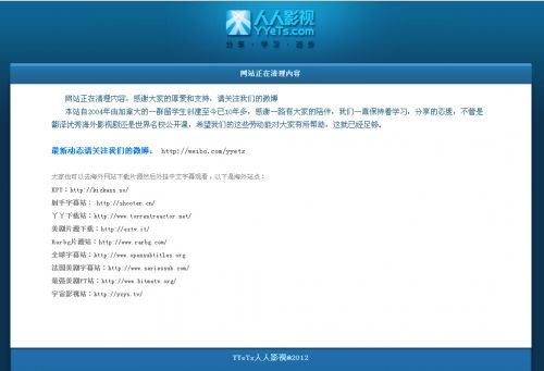 公告稱:“網站正在清理內容,感謝大家的厚愛和支持,請關注我們的微博。本站自2004年由加拿大的一群留學生創建至今已7年多,感謝一路有大家的陪伴,我們一直保持著學習,分享的態度,不管是翻譯優秀海外影視劇還是世界名校公開課,希望我們的這些勞動能對大家有所幫助,這就已經足夠。”