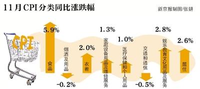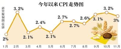 CPI已經連續三個月維持在“3時代”。國家統計局12月9日發布數據顯示,11月份,全國居民消費價格(CPI)總水平同比上漲3.0%,此前,9月CPI達3.1%,10月達3.2%,均超過3%。