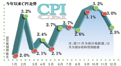 根據今年11月份國家統計局公布的數據,1-11月平均,全國居民消費價格總水平(CPI)比去年同期上漲2.6%。曾有機構此前預計,今年全年CPI同比增幅約為2.6%。也有不少專家表示,今年CPI低于全年調控目標無懸念。如果按照機構預測,即12月份CPI為2.5%,那麼今年CPI低于政府全年3.5%的物價控制目標。(記者李蕾)