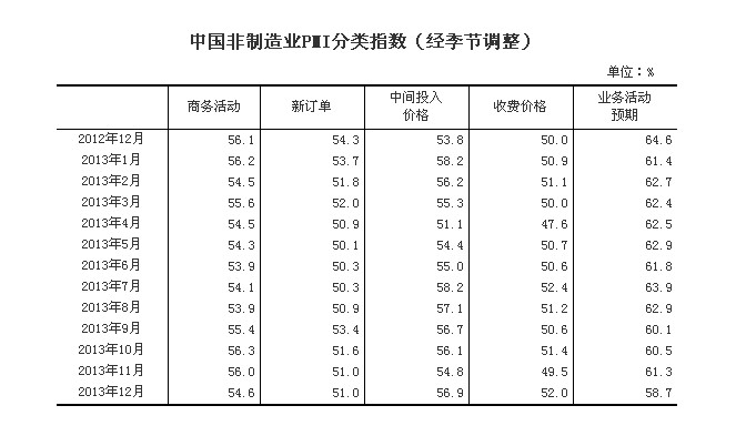 非制造業採購經理調查問卷涉及業務總量、新訂單(業務需求)、出口、在手訂單、存貨、中間投入價格、收費價格、從業人員、供應商配送時間、業務活動預期等10個問題。對每個問題分別計算擴散指數,即正向回答的企業個數百分比加上回答不變的百分比的一半。