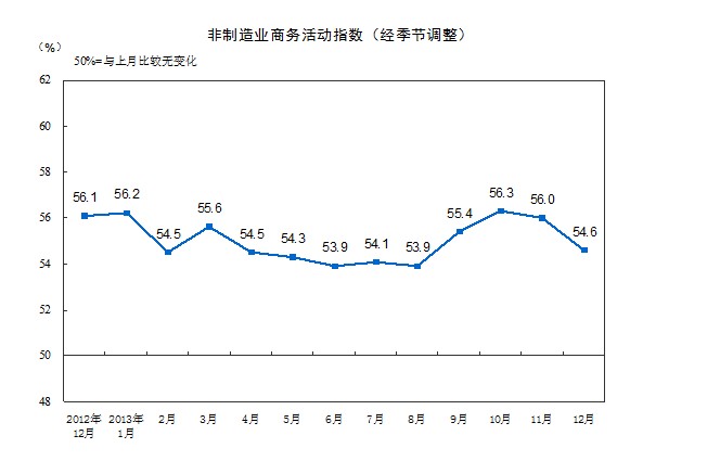 新華網消息 據國家統計局網站消息,中國非制造業商務活動指數為54.6%,比上月回落1.4個百分點。