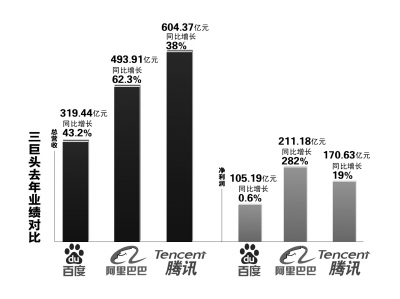其中值得注意的是去年的第四季度,阿里巴巴的營收和凈利潤均呈現同比大幅增長態勢——營收30.58億美元,同比增長66%,凈利潤13.64億美元,同比增長110%。而同期BAT當中的另外兩家的業績表現分別是:騰訊控股營收27.83億美元,同比增長40%,凈利潤6.41億美元,同比增長13%;百度營收15.73億美元,同比增長50.3%,凈利潤4.55億美元,同比下滑0.4%。這也就是說在BAT三家最新財季的表現當中,正在衝擊上市的阿里巴巴無疑最為搶眼。