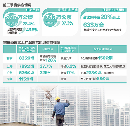 北京市前三季度在土地交易市場共推出住宅用地835公頃,其中商品住宅用地供應589公頃,同比增長128%,接近過去5年年均供應量的九成;上海市前三季度供應住宅用地789公頃,同比增加37.7%,較前5年平均供應量增加6.2%;廣州市前三季度供應住宅用地526公頃,同比增加229%,較前5年平均供應量增加17%;深圳市供應住宅用地115公頃,已經接近前5年平均138公頃的供應量。
