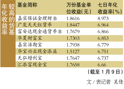 而這兩只都是依賴電商渠道的貨基收益優勢明顯,今年以來,收益連續多日穩定在6%以上。截至1月9日,天弘增利寶、匯添富現金寶的7日年化收益率分別為6.737%和6.66%。