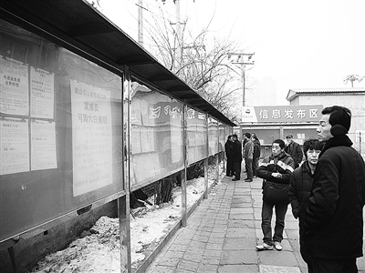 2月15日,北京虎坊橋人才市場門外,求職者正在閱讀櫥窗里的招工信息。工作人員告訴記者,盡管“雙節”已經結束,但預想中的農民工返京潮並未出現,京城用工情況整體偏緊。 本報記者 黃俊毅攝