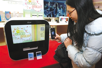 一位女士在聯通營業廳內,體驗通過微信打印照片。3月5日,中國聯通和騰訊公司再度攜手,宣布啟動“一分錢玩轉微信支付打印照片”活動。新京報記者 李飛 攝