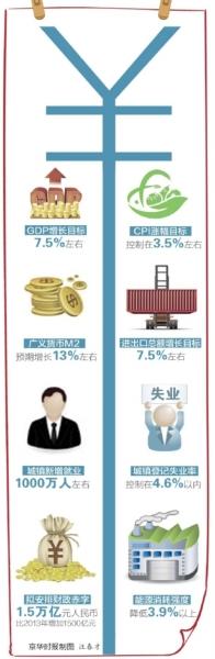 {今年經濟社會發展的主要預期目標是:國內生產總值增長7.5%左右,居民消費價格漲幅控制在3.5%左右,城鎮新增就業1000萬人以上,城鎮登記失業率控制在4.6%以內,國際收支基本平衡,努力實現居民收入和經濟發展同步。}