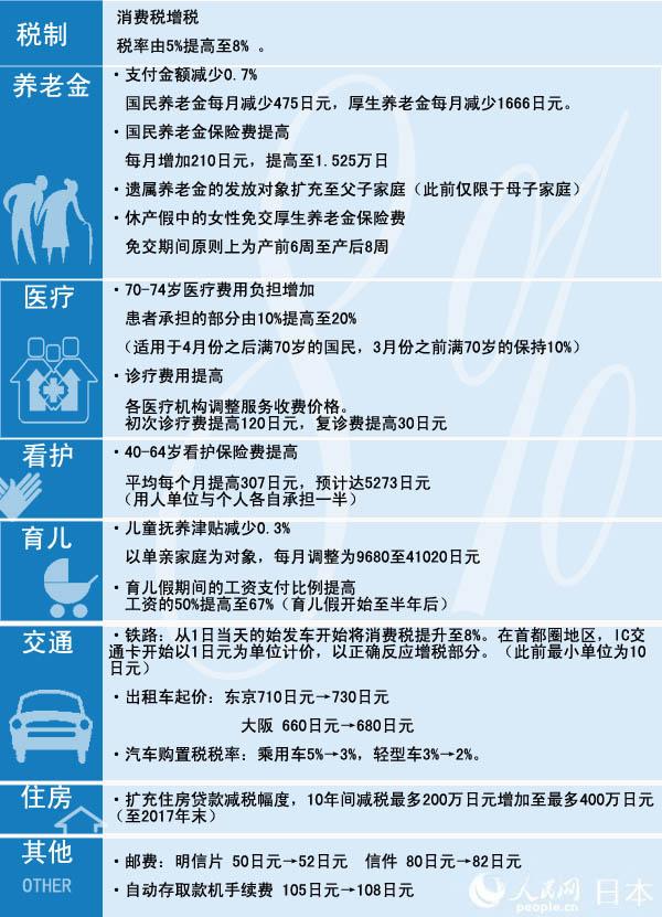 人民網東京3月31日電(張麗婭) 隨著4月1日日本新財政年度的即將到來,很多與生活息息相關的制度將會出現變化。其中,在購物時,或者在享受服務時的消費稅率將由現在的5%提高至8%。這是自1997年4月將消費稅從3%提高至5%後,日本政府時隔17年再次實施消費稅增稅政策。