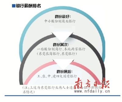 東莞銀行業內部人士告訴記者,在東莞,銀行業平均薪酬最高的當屬一些中小股份制商業銀行,另外一些股份制商行和本地兩家銀行東莞農商銀行、東莞銀行的待遇差不多,再下來就是工、農、中、建四大國有銀行,“小銀行需要薪酬待遇來留人和吸引人才,大銀行平臺大,做業務相對方便很多,所以待遇相對也就差一點,但差距也並不是很明顯。”