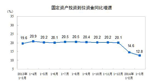 中新網4月16日電 據國家統計局網站消息,2014年1-3月份,全國固定資產投資(不含農戶)68322億元,同比名義增長17.6%(扣除價格因素實際增長16.3%),增速比1-2月份回落0.3個百分點。從環比速度看,3月份固定資產投資(不含農戶)增長1.24%。