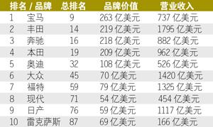 日前,《福布斯》雜志評選出全球最強品牌,按照品牌價值、營業收入、廣告宣傳費用和消費者認可度等綜合因素進行排序。在全球前100位品牌中,汽車整車品牌佔據了10個席位,寶馬以總排名第9的位置佔據汽車行業榜首。其中,德係品牌和日係品牌分別佔據了4席,剩下兩個席位由美國福特和韓國現代所佔據。(記者陳鑫欣)