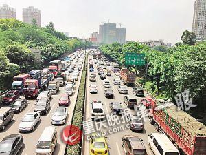 當車緩行到內環高灘岩到上橋的U字形長上下坡路段時,她震驚了:雙向六車道上,車輛綿延兩三公里,紋絲不動,儼然一座大停車場!