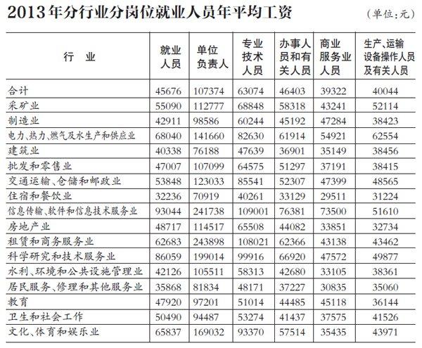 昨日,國家統計局還首次發布了2013年不同崗位平均工資情況,單位負責人平均工資最高,商業、服務業人員平均工資最低,前者是後者的2.73倍。
