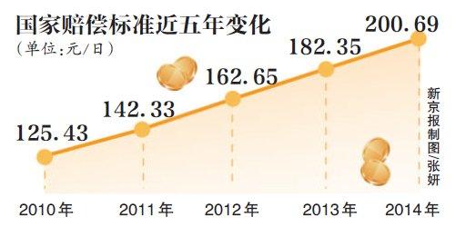 2010年,根據最高法下發的通知,我國涉及侵犯公民人身自由權的國家賠償標準,具體數額為每日125.43元。隨著我國年度職工平均工資的增長,國家賠償標準持續走高。記者通過計算發現,2010年到今年,5年間,國家賠償金標準提高了6成。