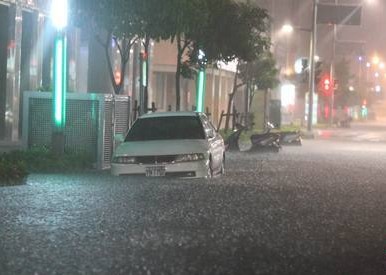 高雄市中正四路上淩晨積水嚴重,停放路邊車輛泡在水里。(圖片來自臺媒)
