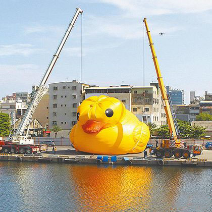 據報道,由荷蘭藝術家霍夫曼設計的黃色小鴨風靡全球,19日下午在高雄光榮碼頭風光登場。但為躲避超強臺風,小黃鴨20日中午被消氣撤下。在19日到20日不到24小時內,小黃鴨吸引近40萬人觀賞。