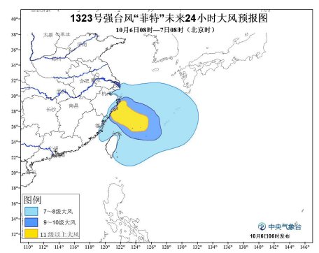 中國臺灣網10月6日消息 中央氣象臺6日早6時發布臺風紅色預警,受今年第23號強臺風“菲特”影響,未來24小時,我國釣魚島附近海域、東海大部海域、臺灣以東洋面、臺灣海峽、南海東北部、巴士海峽以及臺灣東部和北部沿海,福建、浙江等地有大風,江蘇安徽南部、上海、浙江、江西東北部、福建東北部、臺灣北部等地有大雨或暴雨,其中臺灣北部、浙江中東部和南部有大暴雨。