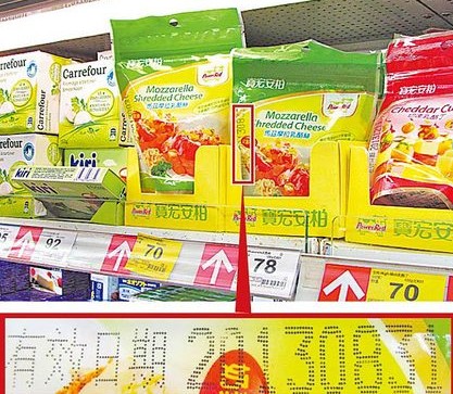 標示8月31日(紅框處)就過期的奶酪絲,9月17日仍在家樂福新店店架上販賣。(圖片來自臺媒)