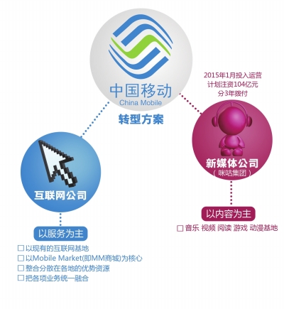 根據已經逐漸清晰的改革思路,中國移動互聯網公司成立的同時也伴隨著其新媒體公司的組建。目前,中國移動擁有九大基地,其中的音樂、視頻、閱讀、遊戲和動漫基地將合並成立新媒體公司,而互聯網公司將以現有的互聯網基地為基礎,以MobileMarket(即MM商城)為核心,整合分散在各地的優勢資源,把各項業務統一融合。從定位來看,新媒體公司將以內容為主,而互聯網公司將以服務為主。