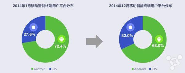 iOS 用戶對操作係統的更新行為更加積極,使用 iOS 8.0 以上版本的用戶達四成以上。具體的情況是 iOS 8.0 的佔比達到 2.1%,8.0.2 為 4.3%,8.1 為 9.7%,8.1.1 為 17.1%,8.1.2 為 7.9%。