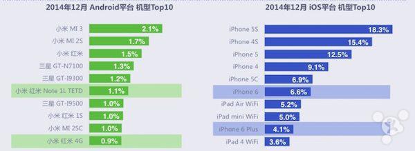 安卓平臺主要機型以小米與三星佔據主流,而 iOS 平臺 iPhone 6 係列佔比已經超過 10%。