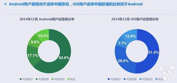 在運營商選擇方面,安卓用戶更傾向選擇中國移動,而 iOS 用戶選擇中國聯通的比例高于安卓。