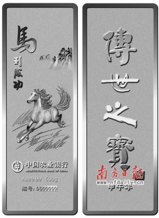 農行此次發售的“傳世之寶”馬年生肖金條,是國內市場上為數不多的採用鍛壓工藝制作的黃金產品,其正面刻有當代藝術大師韓美林先生(奧運福娃設計者)手書的“傳世之寶”字樣,文化內涵豐富。