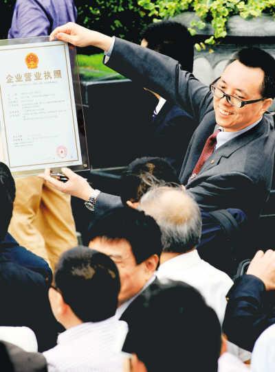 圖為一名首批入駐中國(上海)自由貿易試驗區的企業代表在揭牌儀式上拍照留念。