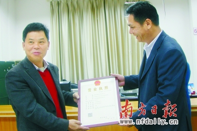 3月3日,新興縣融恆實業有限公司法定代表人(左)領到新興商事登記改革後的首張營業執照。陳海菱 攝