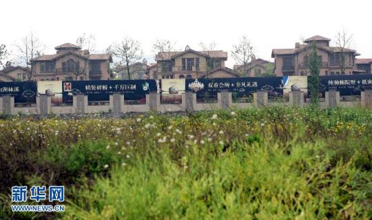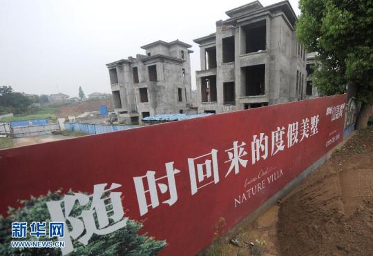 4月26日,杭州青山湖一個被雜草包圍的別墅樓盤。據杭州臨安一季度房地產銷售數據,杭州臨安高端住宅林立的青山湖板塊銷售面積僅佔臨安總銷售面積的9.25%,別墅成交僅19幢。當日,浙江杭州樓市迎來今年最大的一波開盤潮,12家樓盤集中在周末開盤。同時,杭州樓市的第二波降價潮已經彌漫,降價、低開、特價房等各種促銷手段,層出不窮。杭州樓市繼3月份的“馬年首降”以後,在4月下旬引發第二波降價,特別是杭州臨安的青山湖高端住宅板塊大幅降價,讓原本一直堅挺的高端住宅市場卷入了本輪的降價。“別墅賣出公寓價”成為了杭州樓市今年第二波降價中的標志。杭州官方公布的統計數據顯示:今年一季度,杭州市區商品住房成交均價同比下降11.3%,而成交量為10112套,同比下降了37.8%。目前,杭州商品住房成交面臨著量價齊跌的狀況。另外,杭州樓市的庫存壓力仍在不斷攀升,截至3月底,杭州市區可售商品住房76004套,可售面積998.1萬平方米,同比增加36.2%、32.6%。在4月下旬杭州市舉行的2014年一季度經濟形勢分析會上,有官方人士分析說:“杭州房地產市場面臨下行風險。” 新華社記者王定昶攝