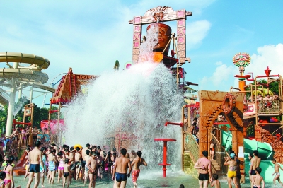 五一小長假,深圳周邊遊和景區遊大熱。圖為歡樂谷瑪雅水公園的水寨活動。周遊 攝