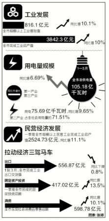 工業經濟走勢的相對平穩體現在全市電力供需增幅的不斷加快。今年1—3月,全市總供電量105.18億千瓦時,同比增長6.69%。盡管第一、三產業的用電量同比為負增長,但第二產業累計用電量為75.69億千瓦時,同比增長9.65%,佔全社會用電量的71.51%。