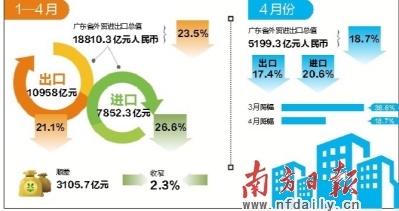 南方日報訊 (記者/吳哲 通訊員/陳琳 尹成剛 葉瑜)據海關統計,2014年1—4月廣東省外貿進出口總值18810.3億元人民幣,比上年同期(下同)下降23.5%;同期全國下降3.1%,佔同期全國外貿總值的23.2%。其中,出口10958億元,下降21.1%;進口7852.3億元,下降26.6%,順差3105.7億元,收窄2.3%。