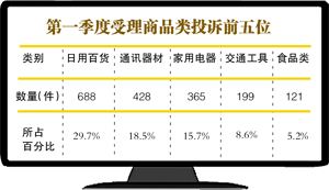 今年第一季度受理的家用電器類投訴量為365件,與去年同期基本持平,但電視機類投訴量上升顯著,共受理52件,同比上升160%。主要為在保修期間屏幕出現直線、斑點、開裂、黑屏,電視機存在雜音,經營者拖延維修或以非性能故障為由要求消費者支付維修費用等情況。 (文、表/記者劉鵬飛)