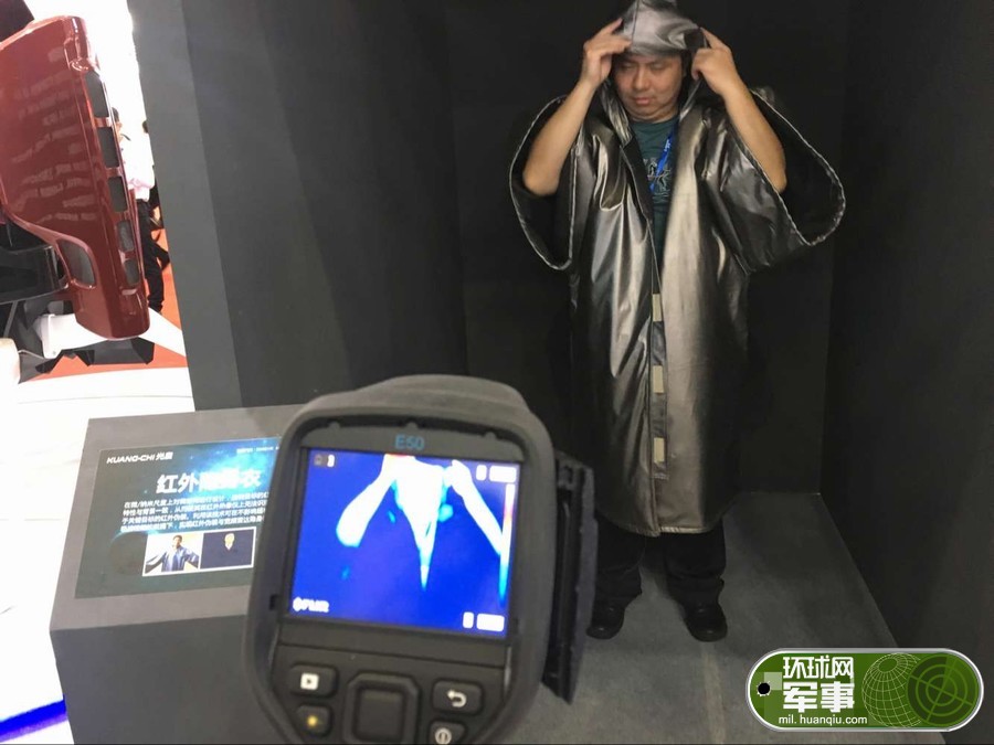 11月1日,第十一屆中國航展在廣東珠海隆重開幕。在室內展館,除了各類航天航空裝備外,還有一些比較奇特的武器裝備也同時參展。在室內展館,國內廠商就展出了一款隱身衣,並邀請觀眾體驗。從手持紅外成像儀可以看到,在穿上這件隱身衣後,人體的紅外特徵基本消失。(攝影“劉昆 范辰言)
