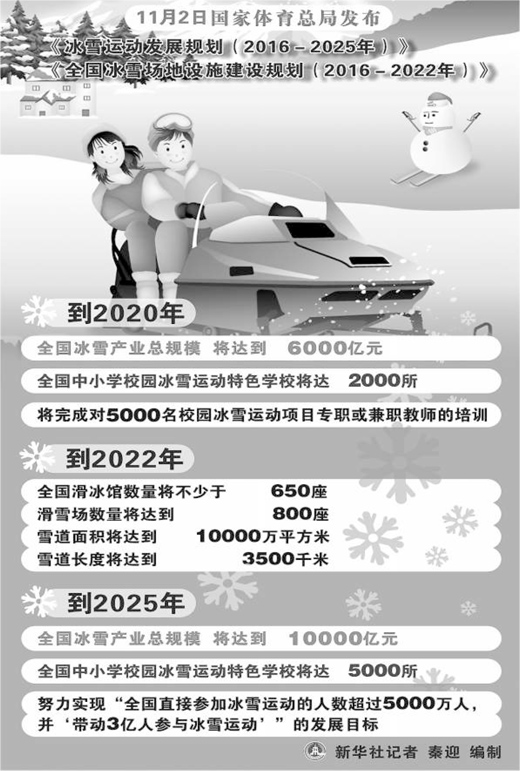 國家體育總局2日發布了《冰雪運動發展規劃(2016—2025年)》(以下簡稱《規劃》)及《全國冰雪場地設施建設規劃(2016—2022年)》(以下簡稱《設施建設規劃》)。《規劃》明確提出到2025年,要實現直接參加冰雪運動的人數超過5000萬人並“帶動3億人參與冰雪運動”,冰雪產業總規模將達到10000億元。