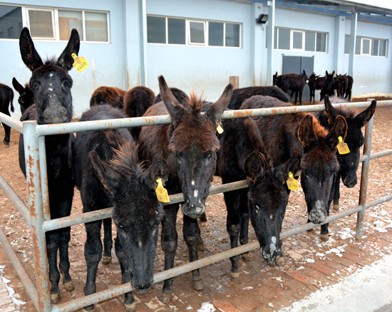 山東東阿國家黑毛驢繁育中心。每一頭毛驢都有黃色耳標,保證全程可追溯。